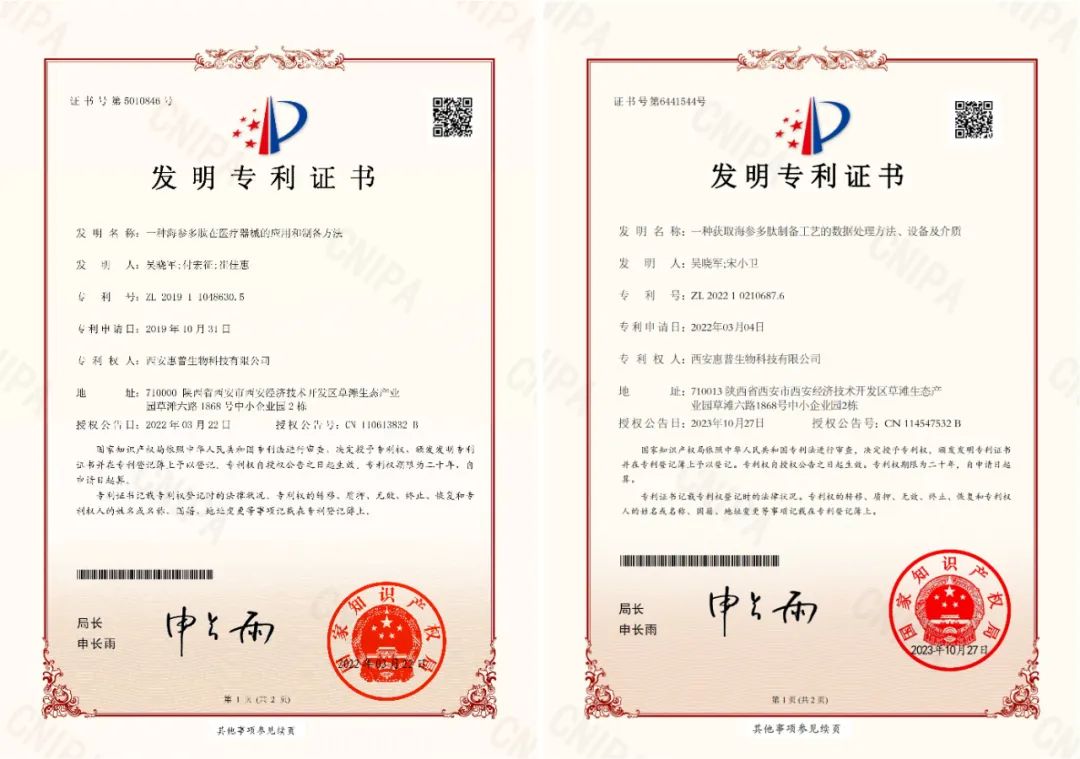 另一方面,惠普生物非常注重知識(shí)產(chǎn)權(quán)保護(hù),充分發(fā)揮自身的創(chuàng)新研發(fā)優(yōu)勢,積極布局原料和平臺(tái)技術(shù)方面的專利,先后獲得了:一種海參多肽在醫(yī)療器械的應(yīng)用和制備方法(ZL 2019 1 1048630.5)及一種獲取海參多肽制備工藝的數(shù)據(jù)處理方法、設(shè)備及介質(zhì)(ZL 2022 1 0210687.6)兩項(xiàng)中國發(fā)明專利,這是技術(shù)革新中實(shí)踐和探索的結(jié)晶,而化妝品新原料的成功備案,可以說是惠普生物海參肽的第三個(gè)里程碑。